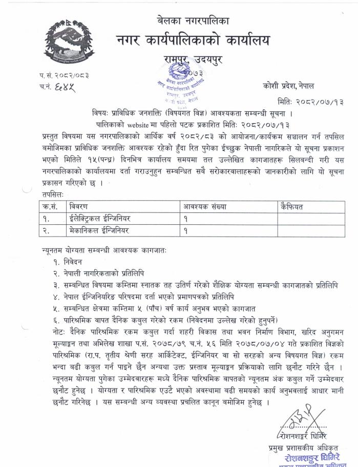 प्राबिधिक जनशक्ति(बिषयगत विज्ञ) आवश्यकता सम्बन्धी सूचना !!!!